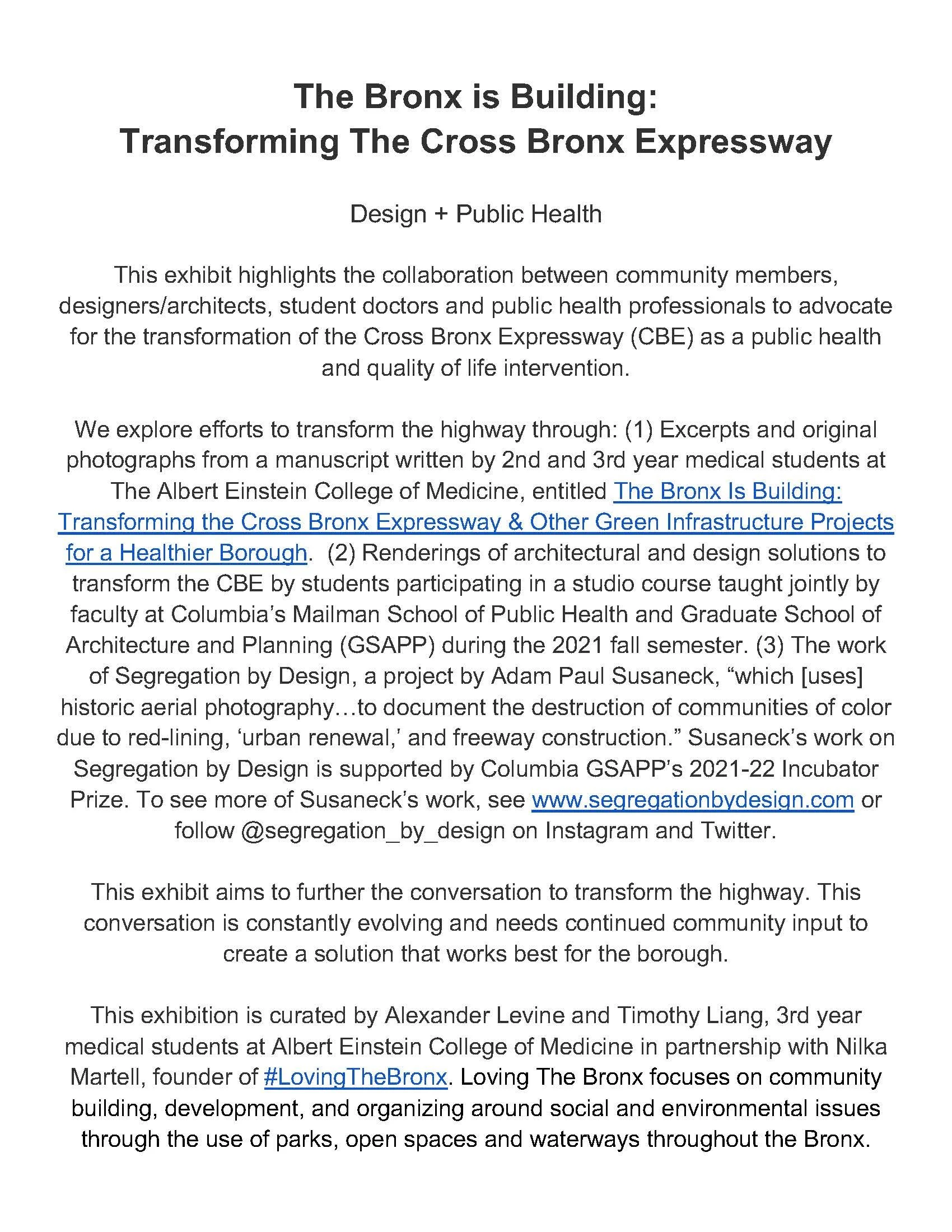 The Gallery of ARTFul Medicine showcases medically themed contemporary art within the unique context of a medical center,” said Jodi Moise, director of the Fine Art Program and Collection at Montefiore Medicine. “We encourage artists to interpret scientific/medical research and create works of art depicting issues of cultural, political, and technological significance. When Alex and Tim approached me about their project, I recognized that their efforts illustrate how the potential transformation of the Cross Bronx Expressway could be a public health intervention for the Borough of the Bronx and knew it would be a fitting exhibition for us to host.”