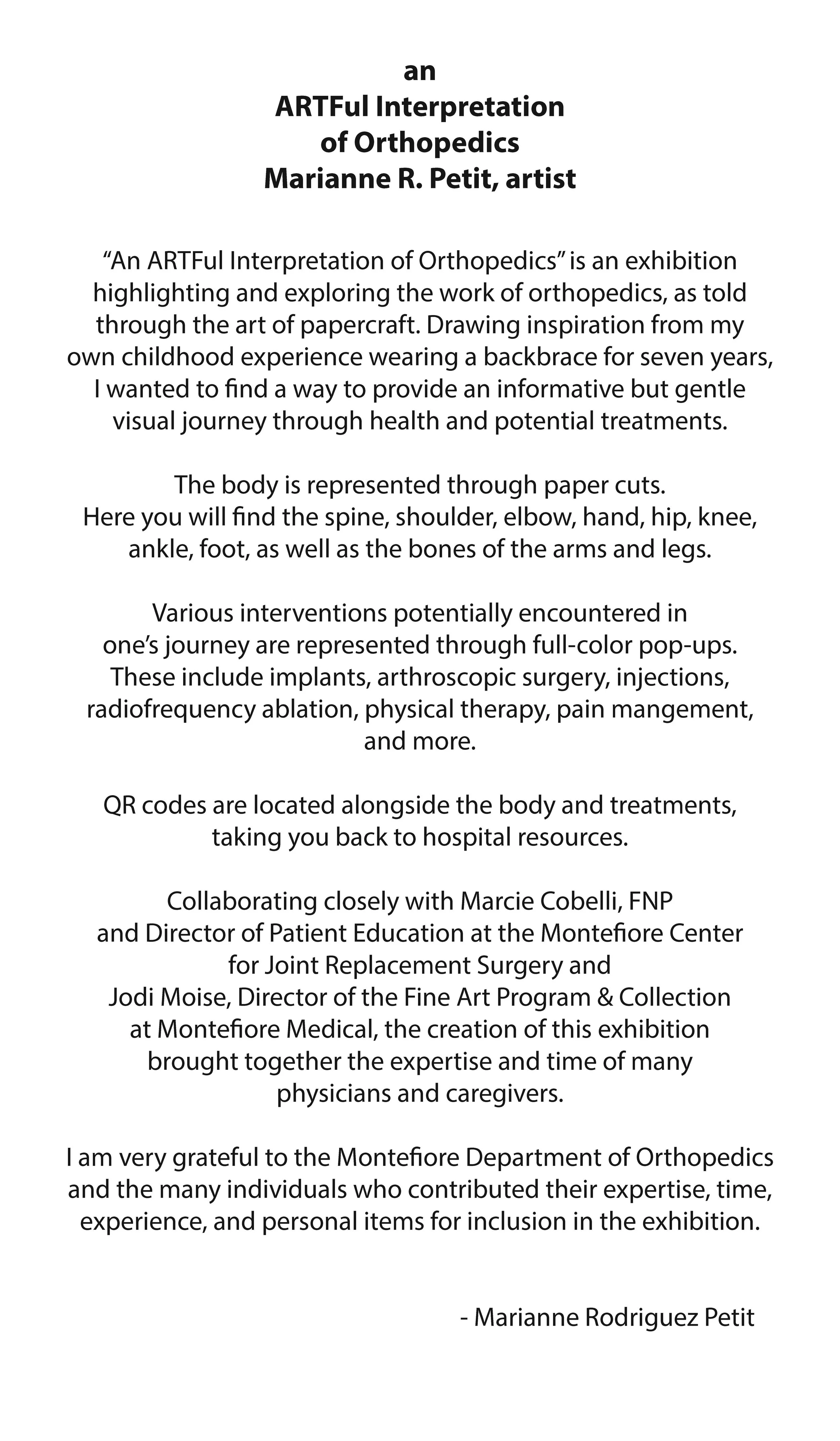 “From its inception, a cornerstone of our programs have included students working towards an exhibition of their work within their schools and in public and private spaces. I am so pleased to extend the reach of our students into another important institution in New York City, thanks to the partnership with Montefiore, our host for this vibrant example of the work of New York City’s young residents of the Bronx. I am delighted to collaborate with an organization that shares our belief in the power of artistic expression towards learning and healing”.